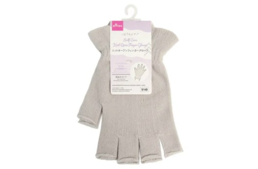 ダイソーでは、2025年も「おうちケアニットオープンフィンガーグローブ(グレー)」などの指なしタイプを販売中。