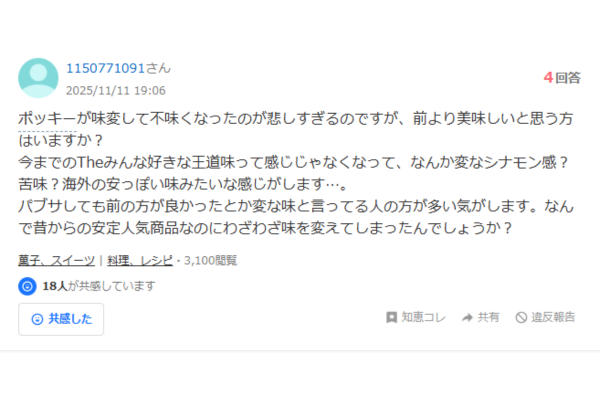 リニューアル後のポッキーについては「昔の方が好きだった」「味が薄くなった」「なんだかシナモンっぽい不思議な風味がする」という声も多く見られます。